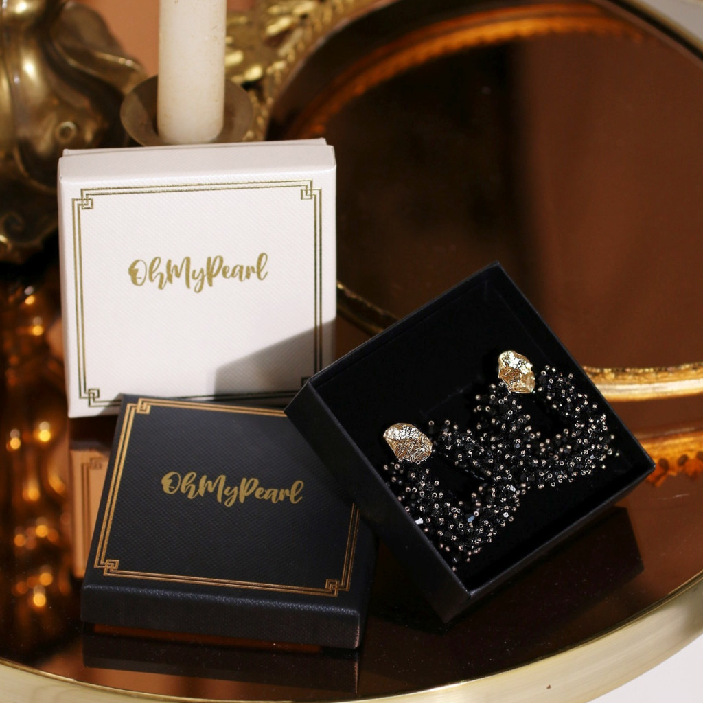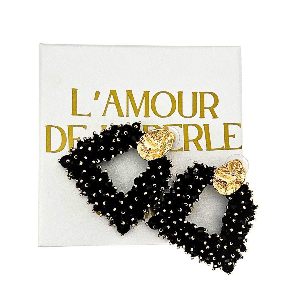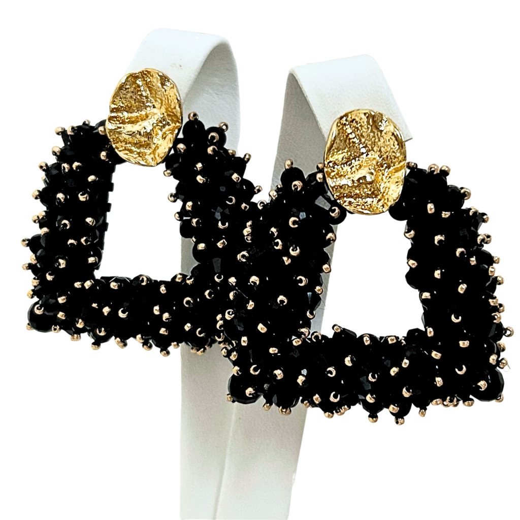 Swarovski kristályból, spinell utánzatból , cseh -és japán üveggyöngyből készült fekete -arany színű klasszikus Daisy fülbevaló.