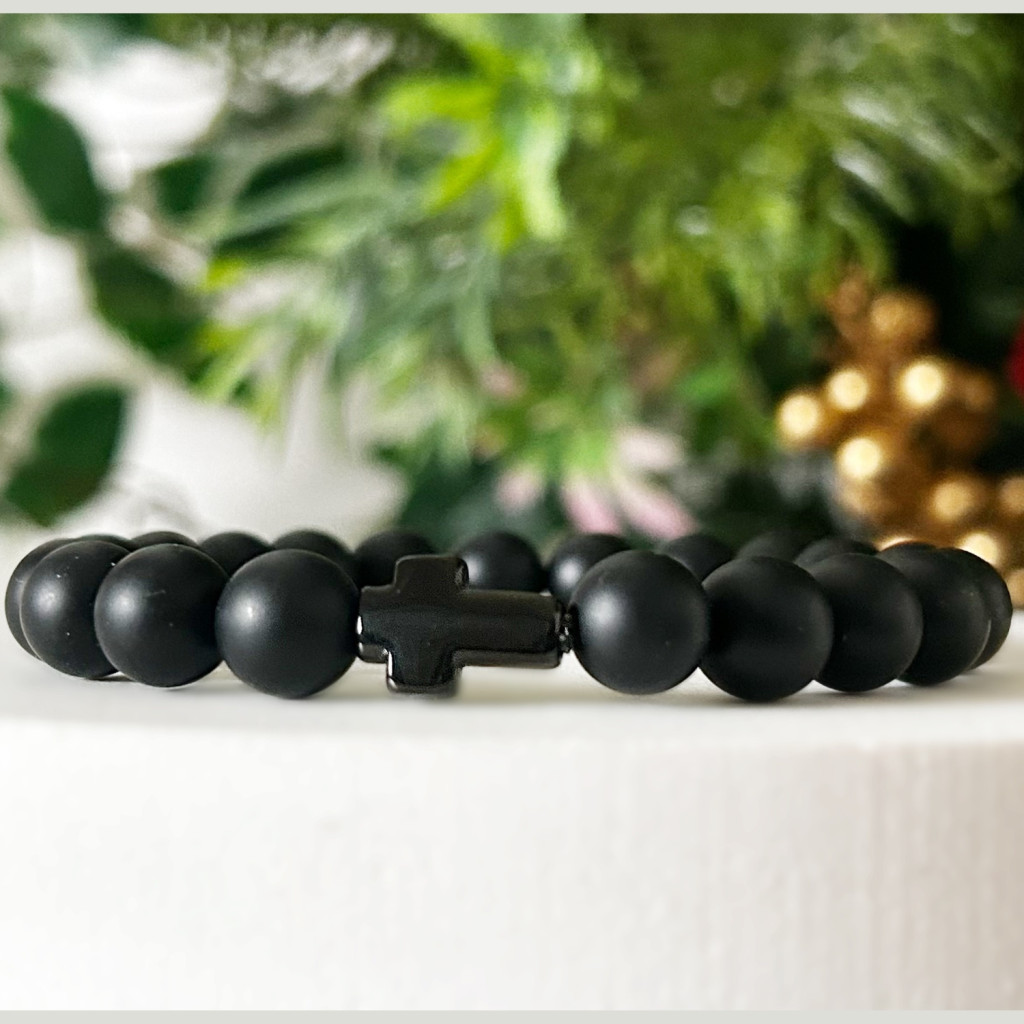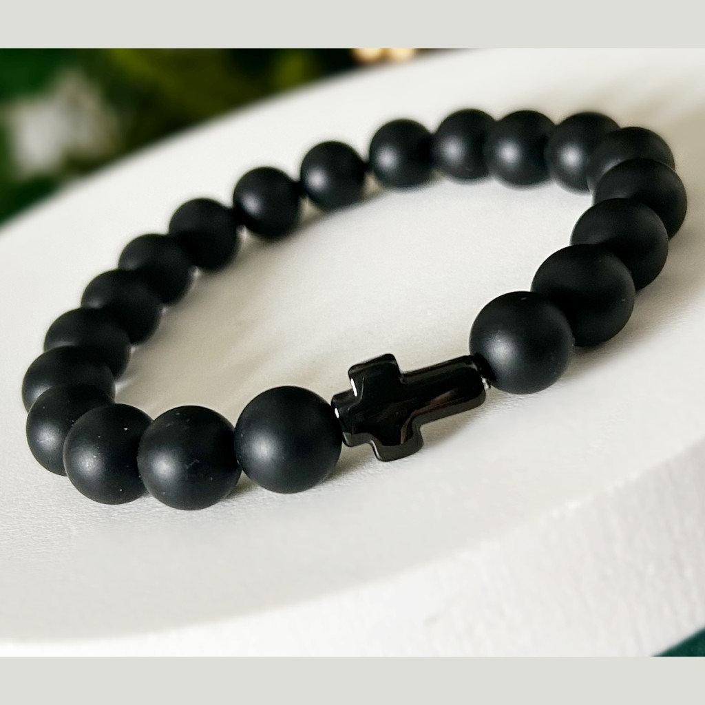 Ónix ásványból készült karkötő, amely a nyugalom köve, fekete orvosi acél kereszttel.