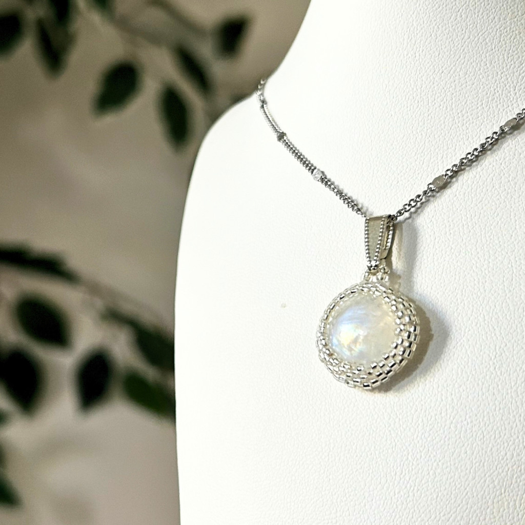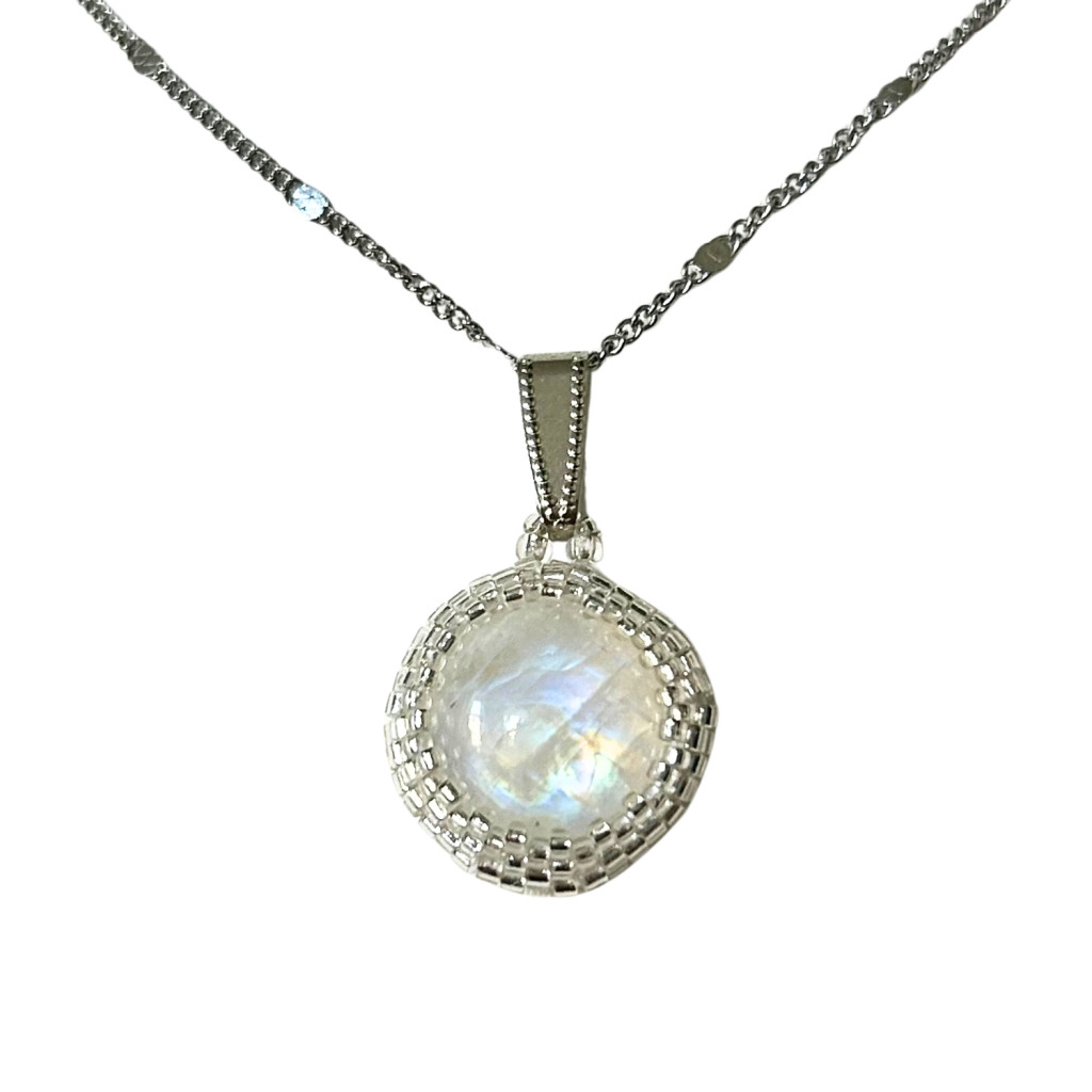 Japán üveggyönggyel befoglalt kerek holdkő medál.