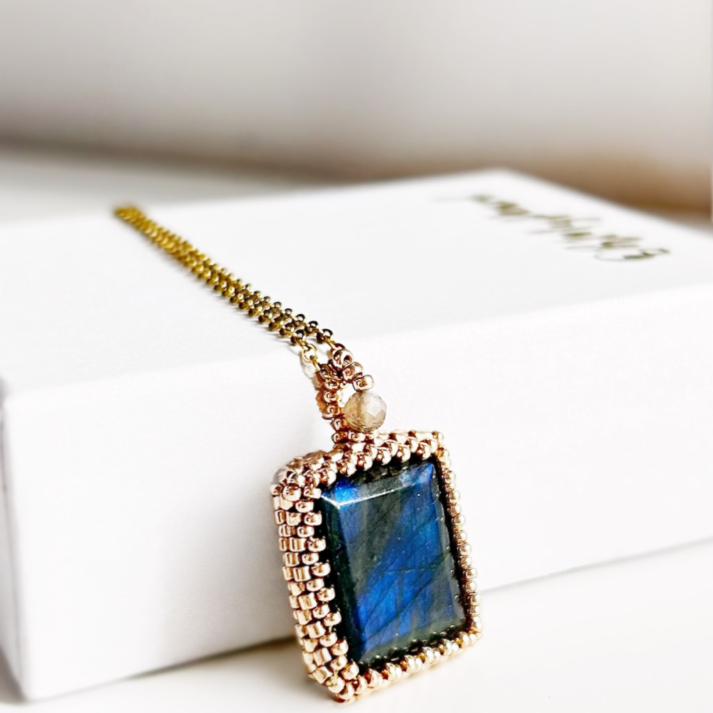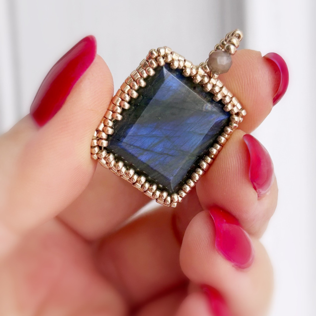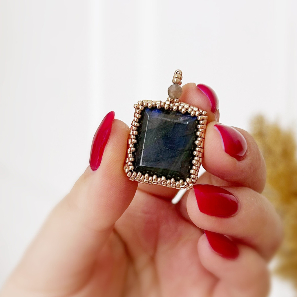Négyzet alakúra csiszolt fazettált labradorit medál japán üveggyönggyel