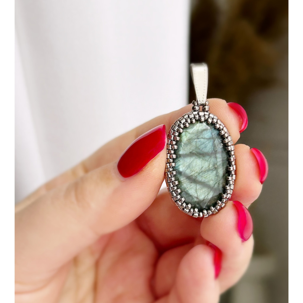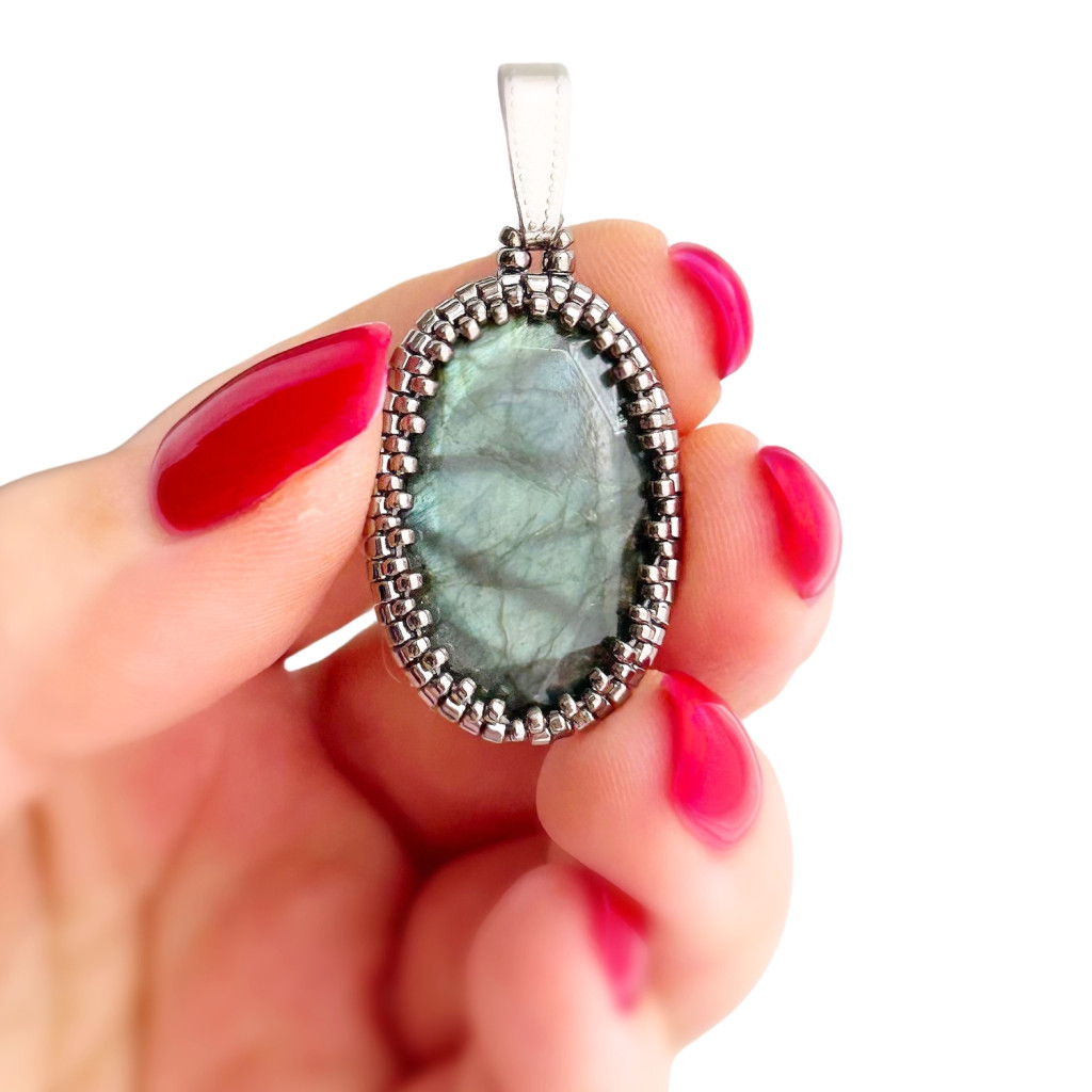 Fazettált csiszolású Labradorit medál japán üveggyöngybe foglalva