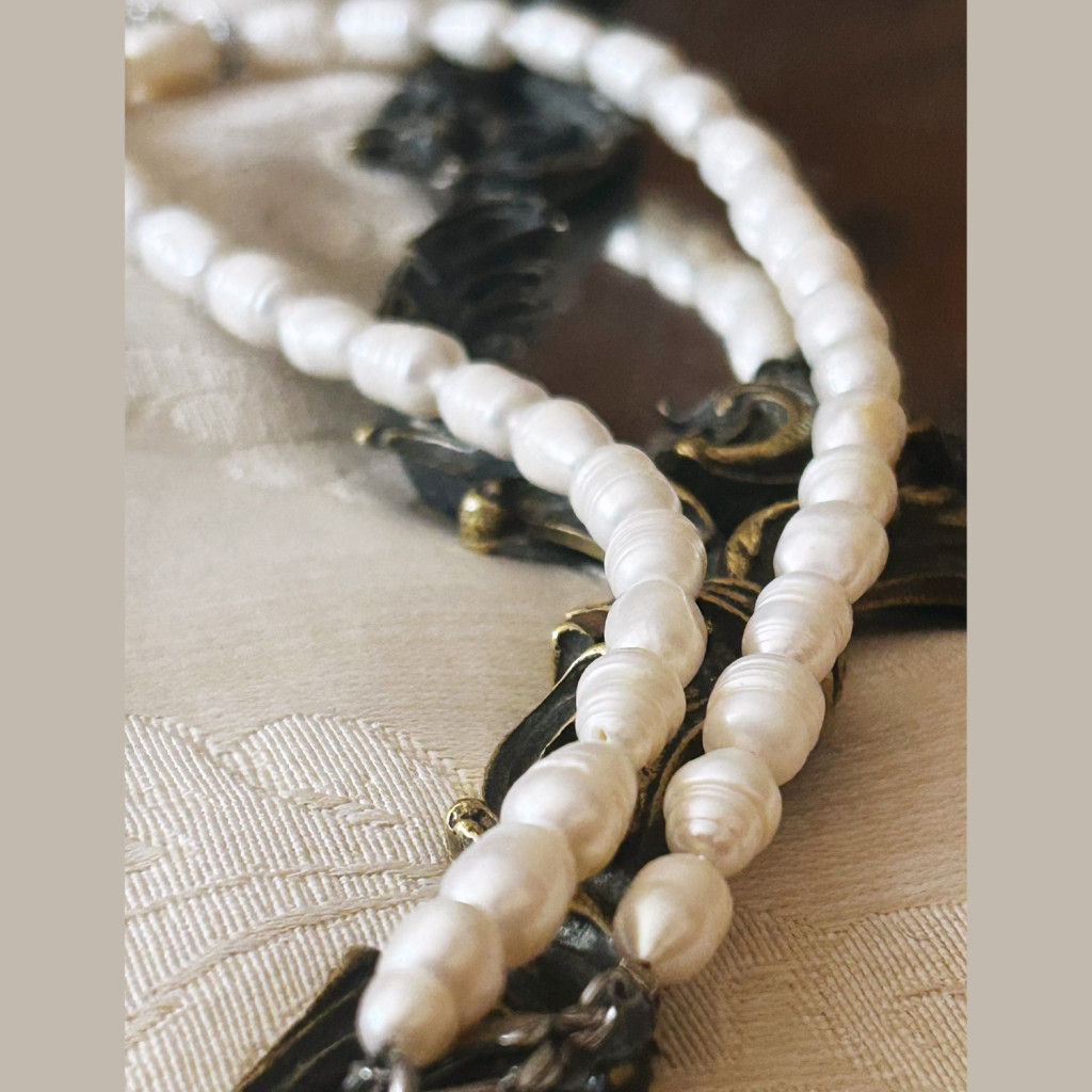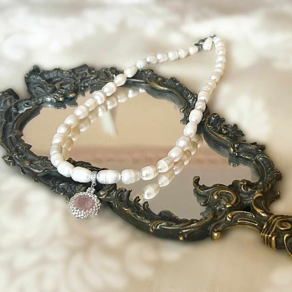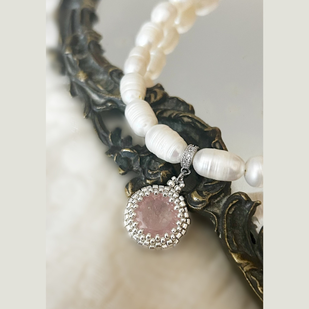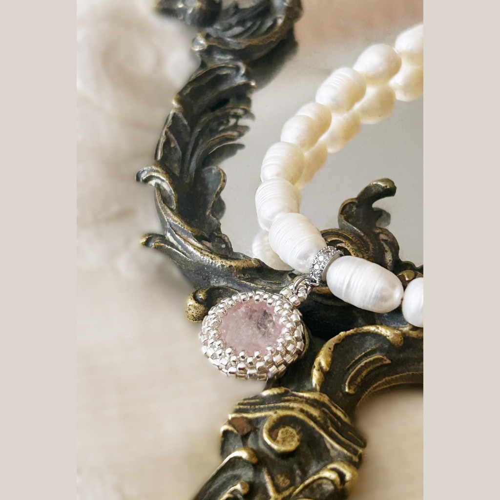 Morganit medál japán üveggyöngybe foglalva édesvízi tenyészett gyönggyel