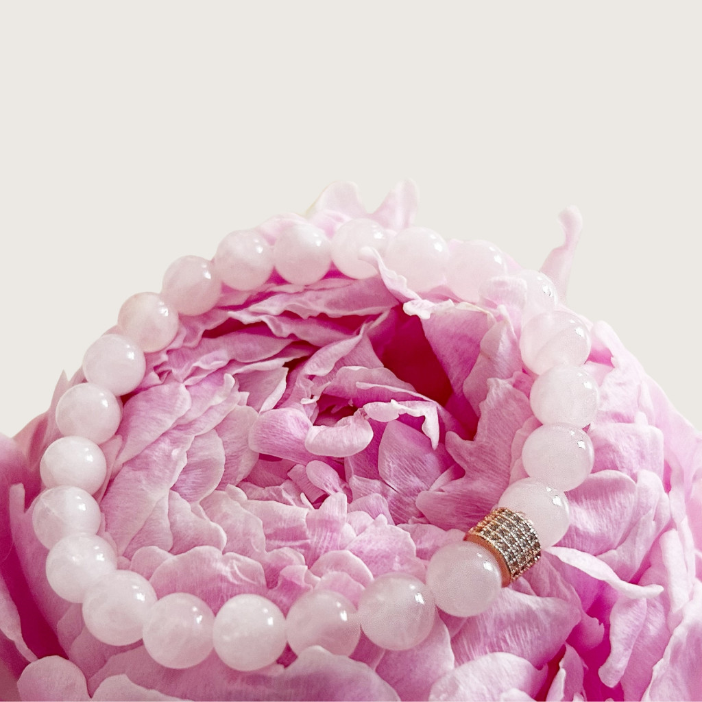Valódi madagaszkári Rózsakvarc karkötő cirkónia kövekkel díszített orvosi acél köztessel.