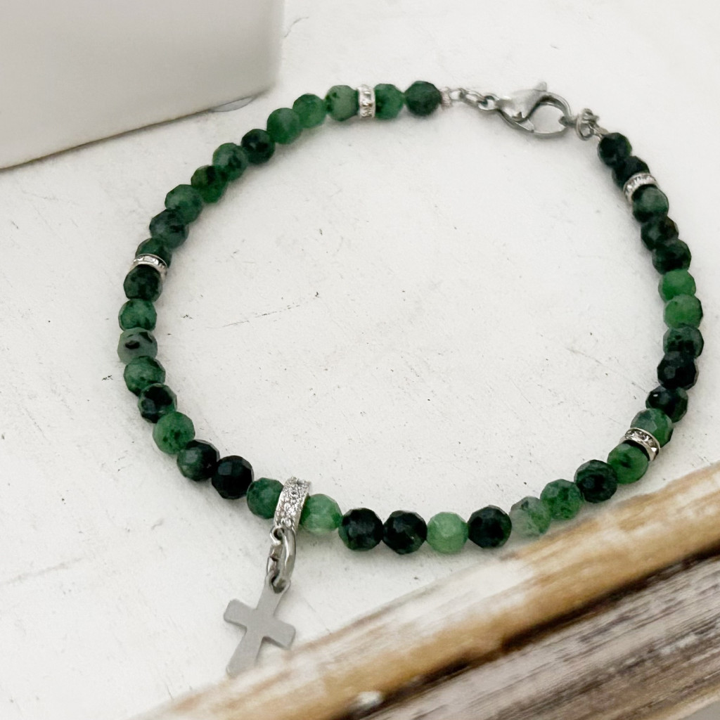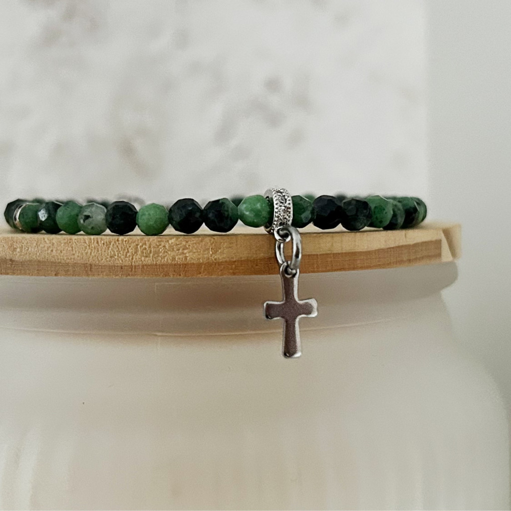 4 mm-es fazettált rubin-zoizit ásványból készült minimál karkötő acél köztessel