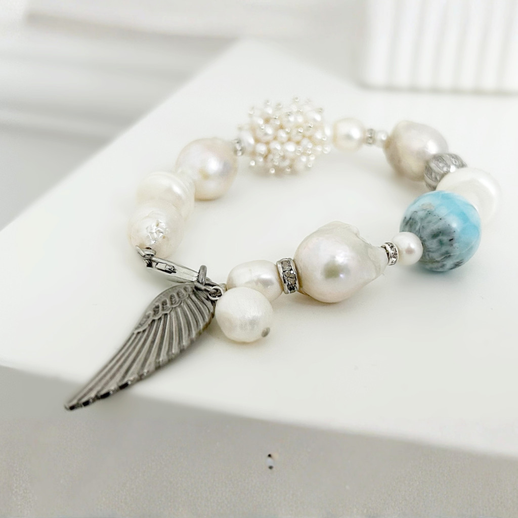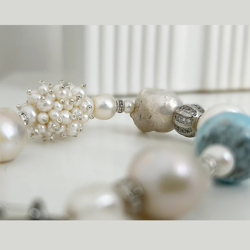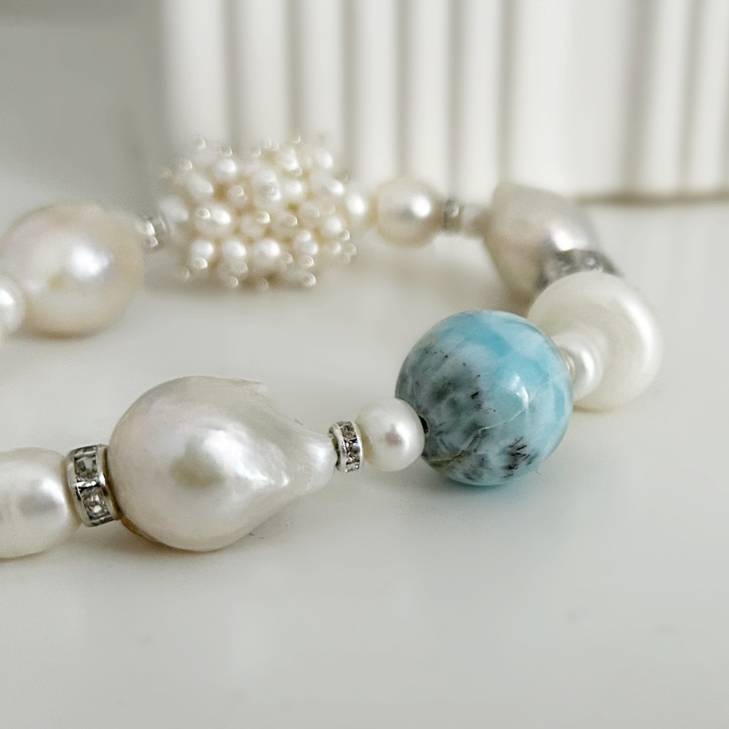 Japán édesvízi barokk tenyésztett gyönggyel készült karkötő 12 mm-es Larimar ásvánnyal, cirkónia kövekkel díszített acél alkatrészekkel.