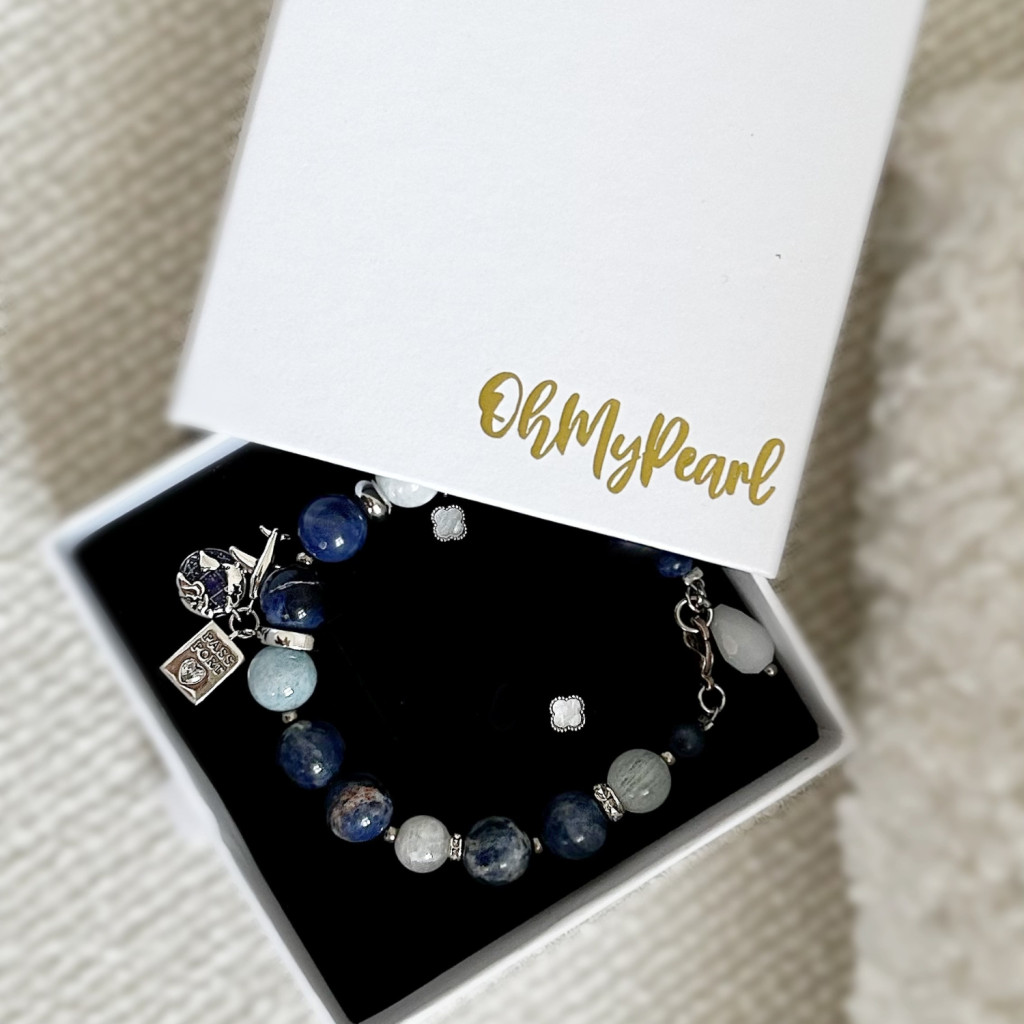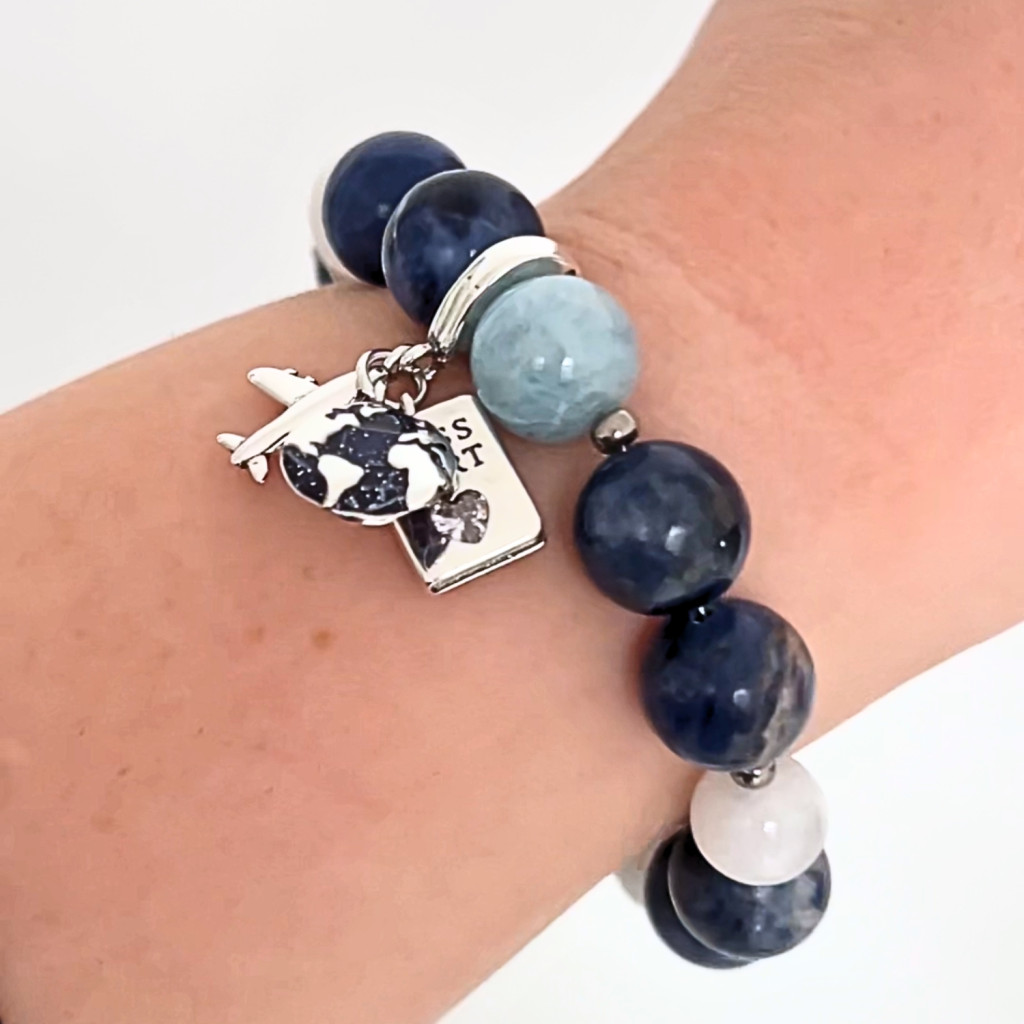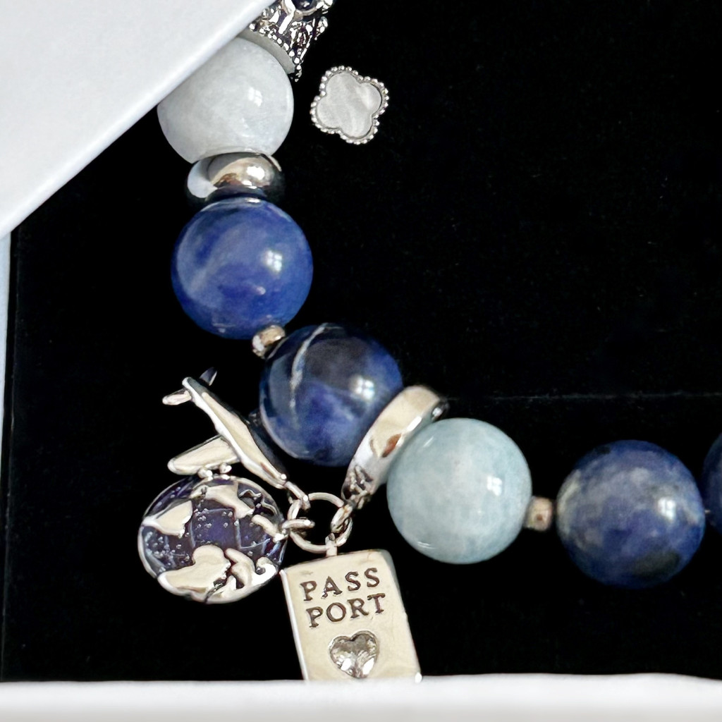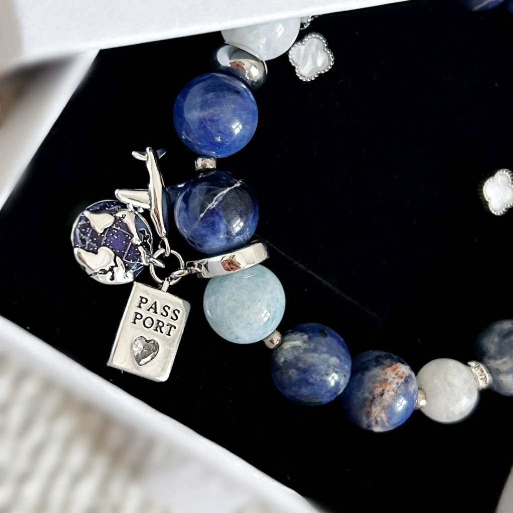 Utazók szerelmeseinek készült karkötő Szodalit ásványból, mely az utazók köve, AJÁNDÉK ezüst fülbevalóval, Akvamarin -és Holdkő ásvánnyal.