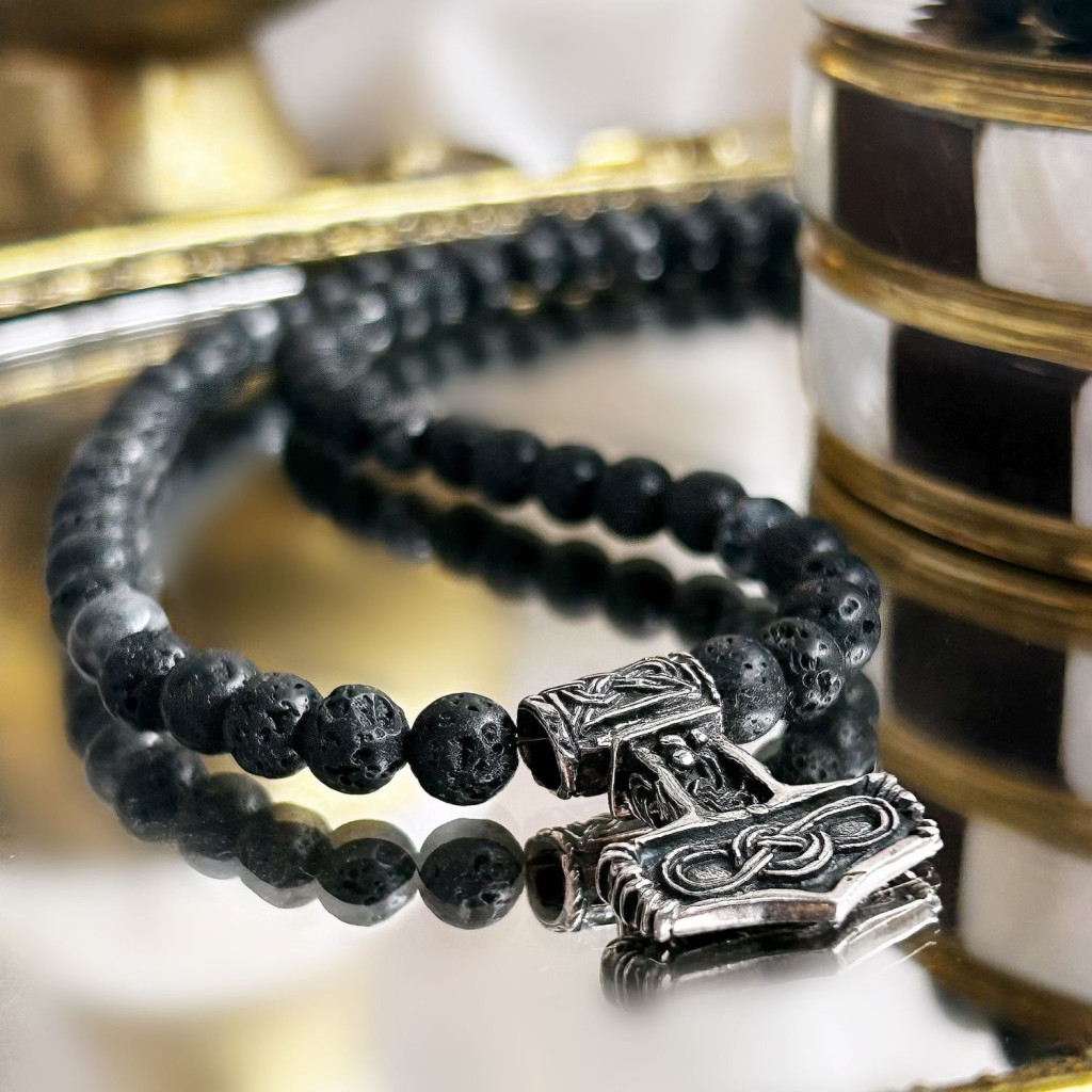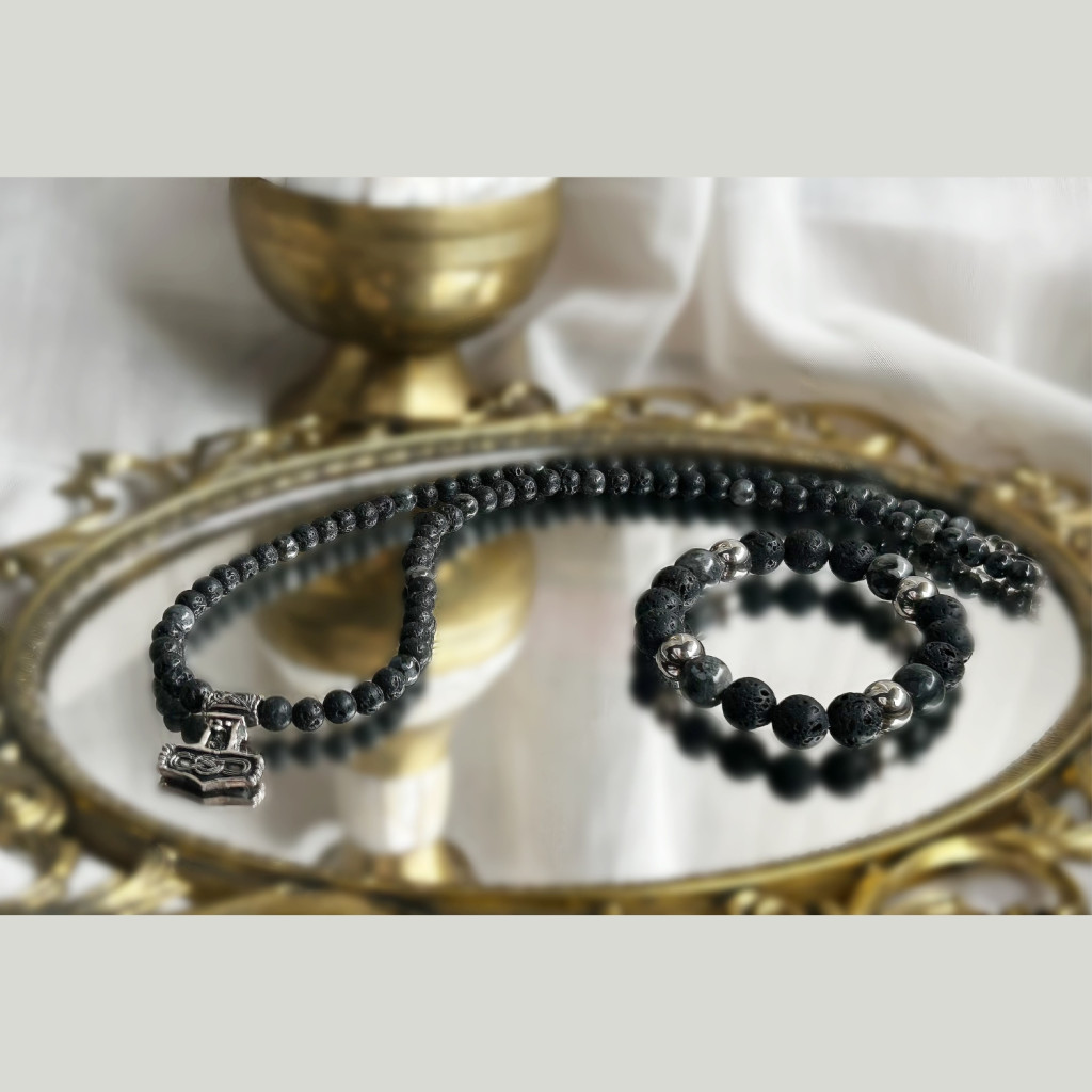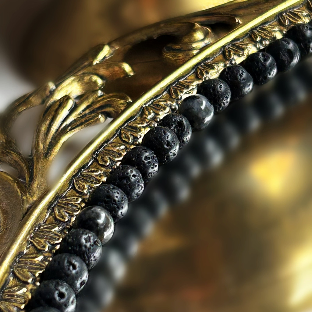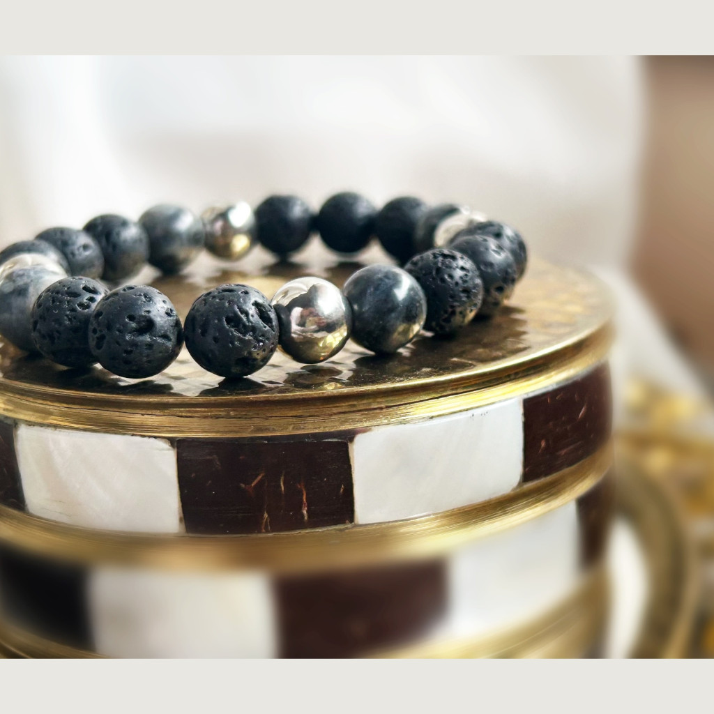 Karkötő: Lávakő ásvány Larvikittel és orvosi acéllal, 19-20 cm-es csuklóra készült.