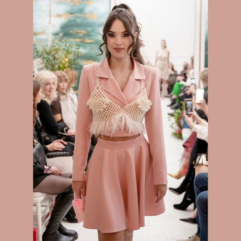 Marabu tollal díszített gyöngytop , amely mell részén külön apró gyönggyel díszített pálya leveles alak, így ruhával -és ruha nélkül is kiváló ruhadarab.